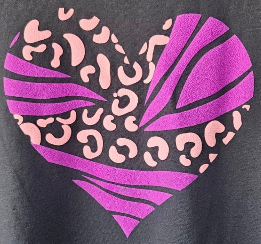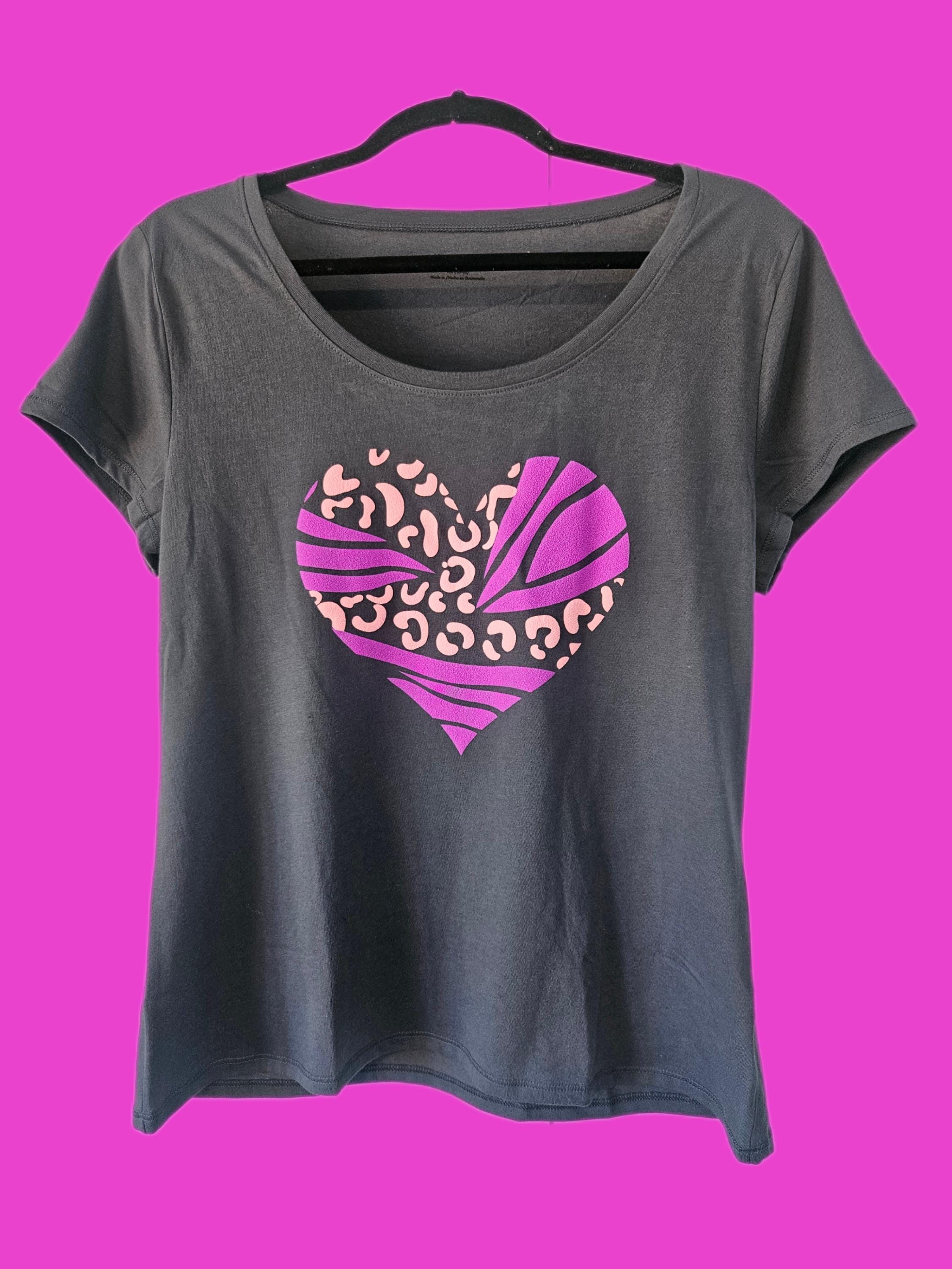 Turn heads and spread love with this eye-catching short-sleeve t-shirt, designed for comfort and flair. Featuring a vibrant heart graphic in stunning pink and purple hues, this tee blends animal print and abstract patterns for a look that’s both playful and powerful.