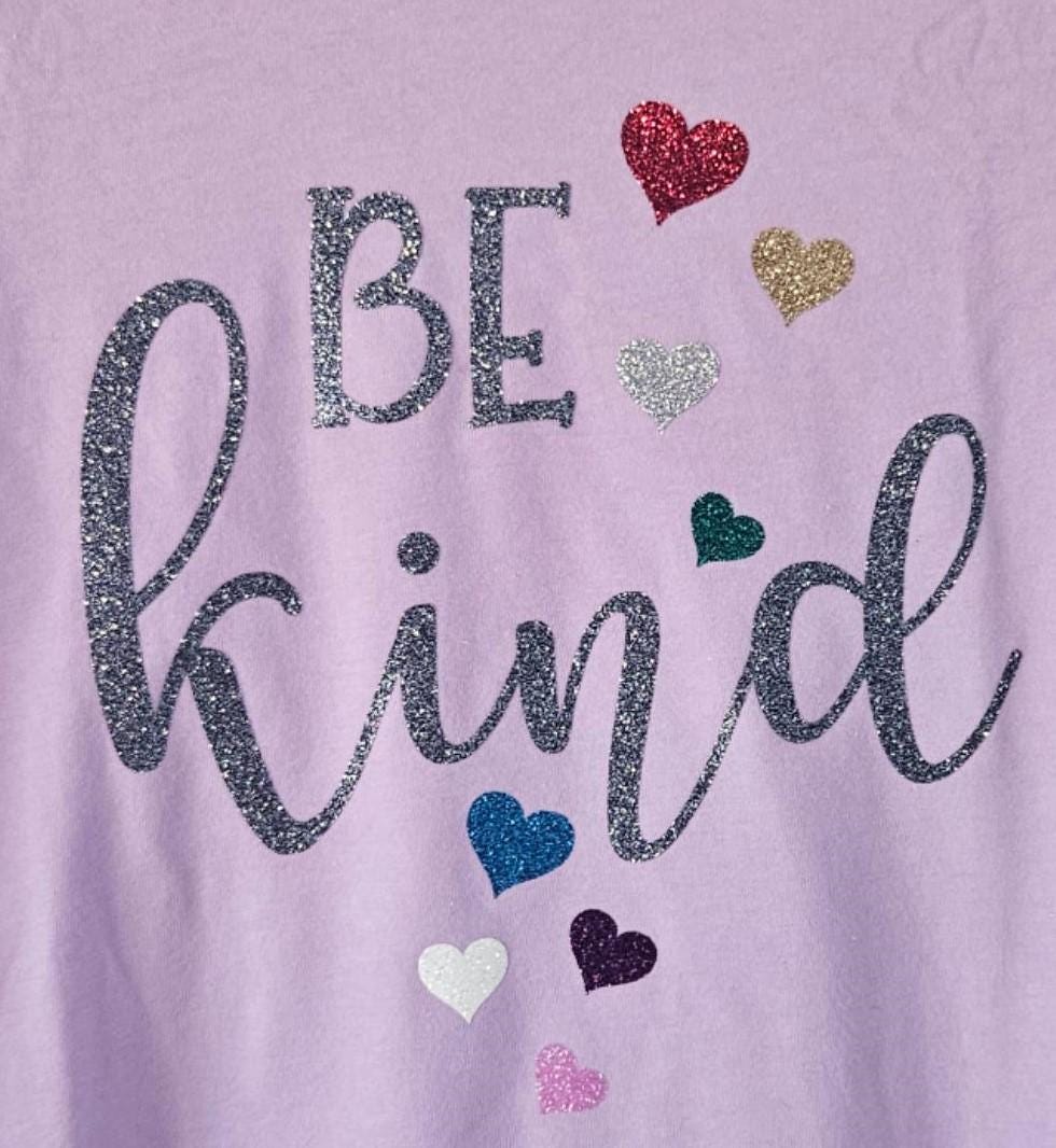 Add a touch of sparkle to your everyday look with this charming lavender t-shirt that’s as uplifting as it is comfortable. Featuring the inspiring message "BE kind" in glittery, eye-catching lettering, this shirt is designed to make a statement — and a difference.
